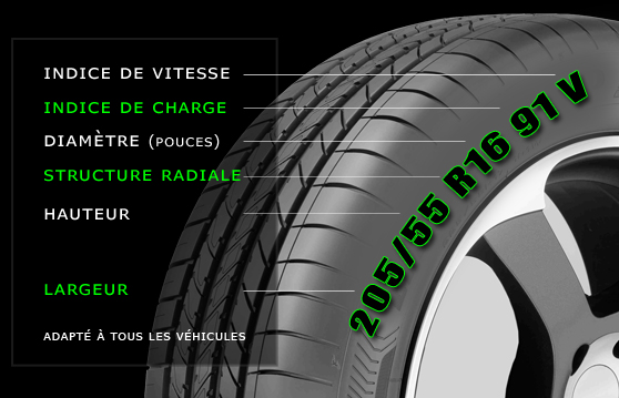 91 : il s’agit de l’indice de charge. Cet indice indique la charge maximale que le pneu peut supporter lorsqu’il est gonflé à la pression maximale sécuritaire. Dans notre exemple cela ne signifie pas que le pneu peut supporter 91kg mais que l’indice est de 91; il faut ensuite se référer à une table de correspondance qui détermine pour chaque indice la charge en kg. Pour un indice de 91, la charge maximale supportée est de 615kg/pneu.